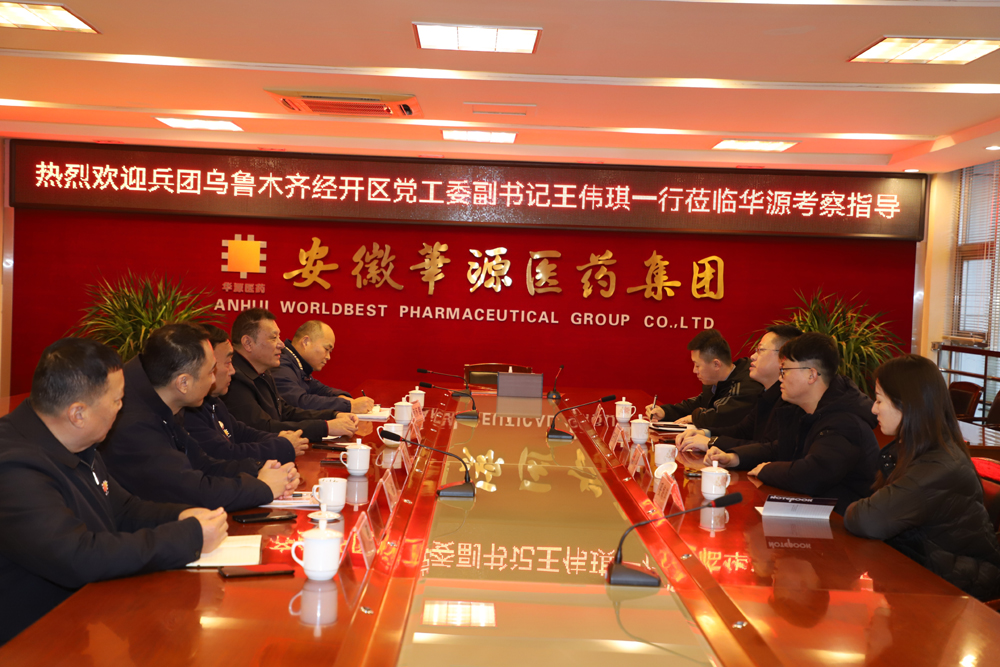 12月12日,兵团乌鲁木齐经济技术开发区党工委副书记、常务副主任王伟琪,经开区管委会投促局局长曹兴明、经开区管委会投促局副局长赵旭秋、经开区管委会投促局招商专员妥海萍等来华源医药集团考察。