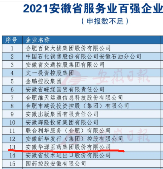 2021安徽省服务业百强企业榜单:华源医药集团第13位