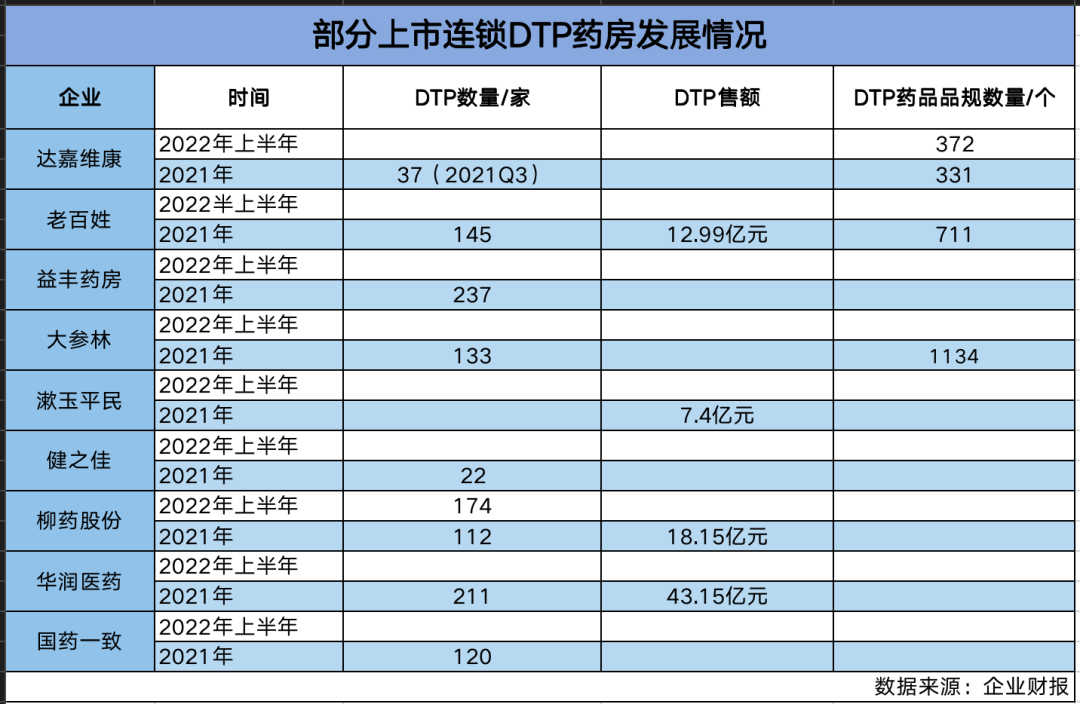 前不久,达嘉维康发布了公司自去年年底上市之后的首份半年报,截至2022年6月底,其销售DTP品规372个,叠加客流增加与品种优化,DTP销售额较去年同期增长25.72%,DTP专业药房业务是目前零售业务增长引擎。