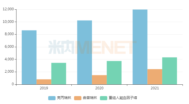 3个生物制剂之一的重组人凝血因子Ⅷ注射剂销售成绩同样喜人,2021年福建省公立医院终端销售收入超过4千万元,同比增长15.58%。从厂家竞争格局看,武田药品市场份额占比超过50%。