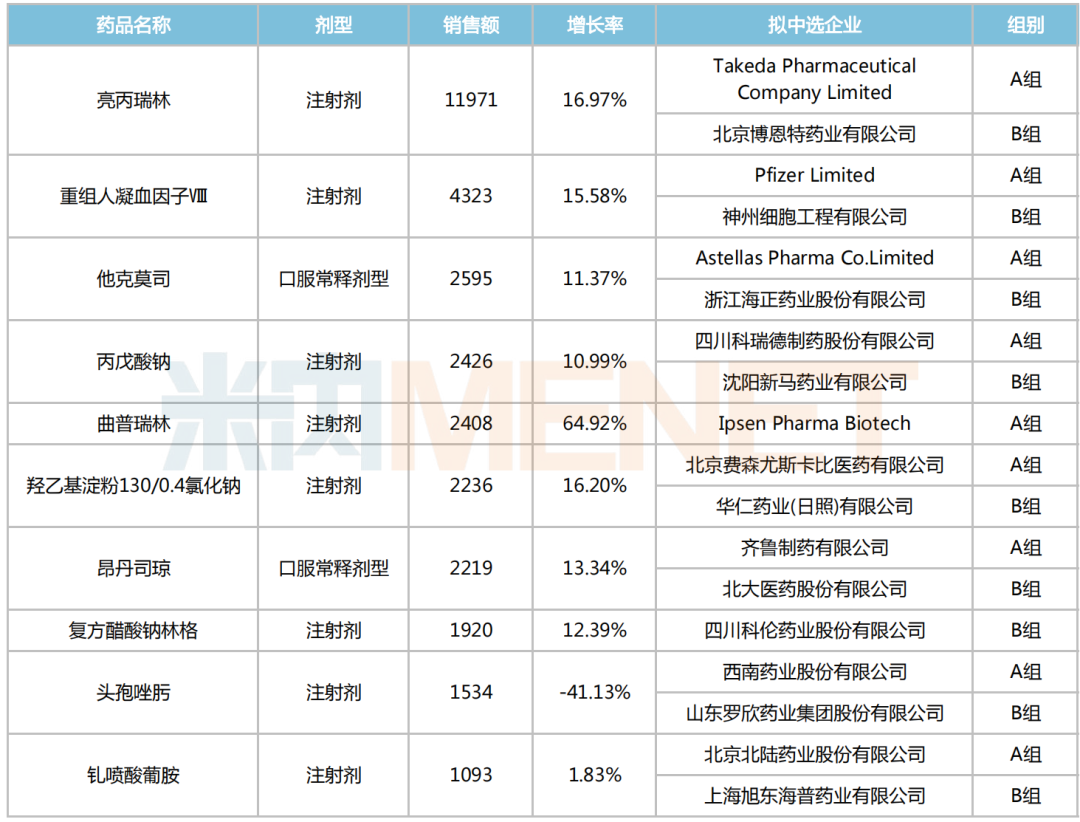 拟中选名单中包含43个品种,2021年在福建省公立医院终端销售规模合计超过4亿元。其中,亮丙瑞林注射剂、重组人凝血因子Ⅷ注射剂、他克莫司口服常释剂、昂丹司琼口服常释剂、复方醋酸钠林格注射剂、钆喷酸葡胺注射剂、羟乙基淀粉130/0.4氯化钠注射剂等品种销售额均超过1000万元。