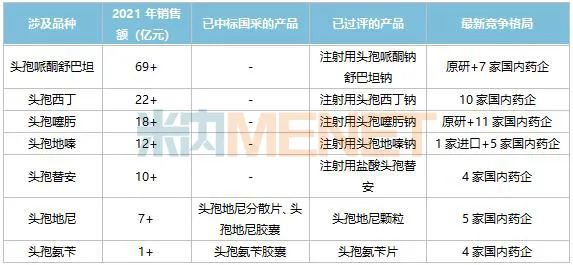 头孢哌酮舒巴坦、头孢西丁、头孢噻肟、头孢地嗪以及头孢替安2021年在中国公立医疗机构终端销售额超过10亿元,目前暂未有产品纳入国采,5款头孢类大品种的注射剂已有4家以上企业过评,是第八批国采的大热品种。