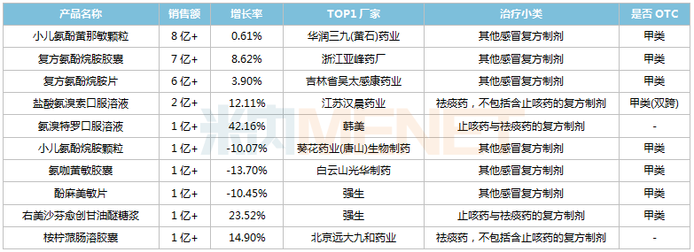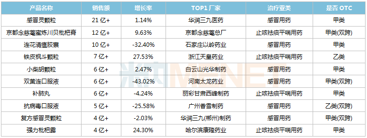 从产品排名看,TOP10产品销售额均超过1亿元,其中6个为感冒复方制剂(2个为儿童常用感冒药),2个为祛痰药(不包括含止咳药的复方制剂),2个为止咳祛痰复方制剂。