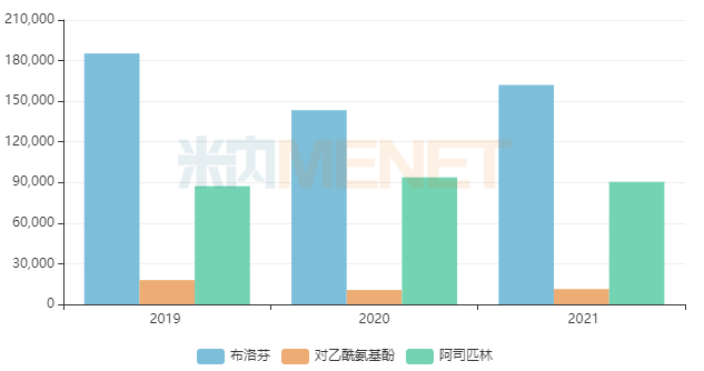 布洛芬、对乙酰氨基酚、阿司匹林为国务院疫情防控综合组印发的《新冠病毒感染者居家治疗指南》中推荐用于发热症状的化学药,这3款药品2021年在中国零售药店终端的销售规模分别超过16亿元、1亿元及9亿元。