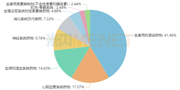 从治疗领域看,41个品种涵盖8个治疗大类,集中在全身用抗感染药物(17个品种)、心脑血管系统药物(7个品种)、血液和造血系统药物(6个品种)等。