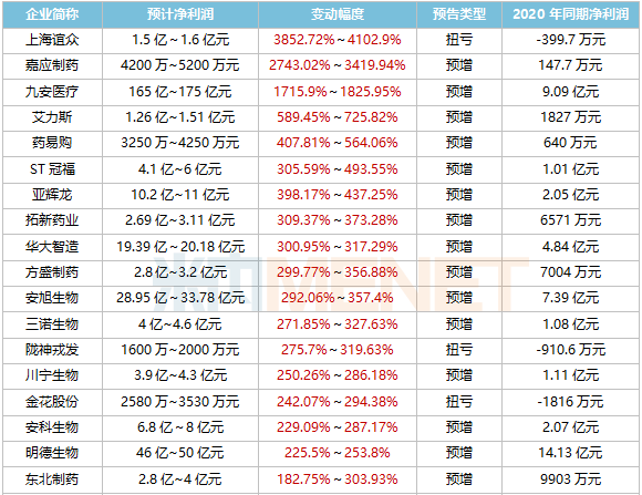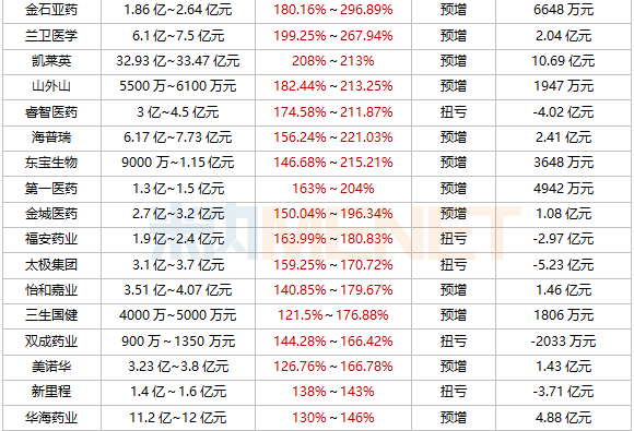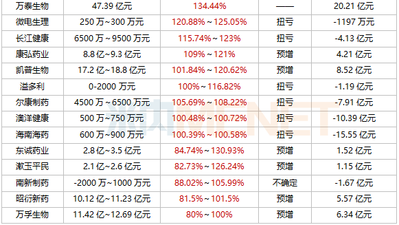 九安医疗净利润最高达175亿元,药明康德、人福医药、济川药业、凯莱英等多家企业均创新高。从增幅来看,超过40家翻倍,上海谊众、嘉应制药、九安医疗暴涨超10倍,太极集团、福安药业、尔康制药等14家扭亏为盈。此外,有90家亏损。