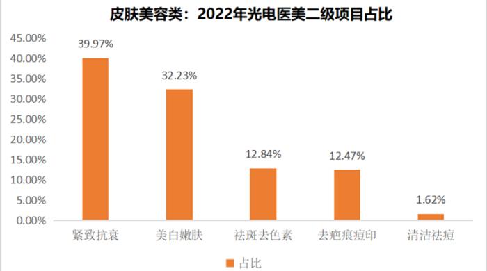 然而皮肤美容类光电医美项目中,2022年紧致抗衰光电医美项目GMV占比为39.97%,美白嫩肤光电医美项目GMV占比为32.23%,与紧致抗衰项目存在一定差距,紧致抗衰“吸金能力”高于美白嫩肤。