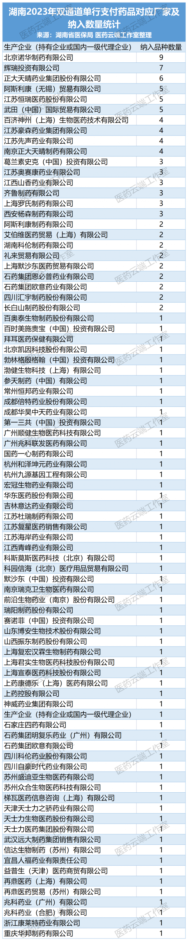 湖南此次新增的123个品种涉及85个企业(按独立法人计),其中,纳入品种数量最多是诺华(9个),其余纳入较多的厂家依次有辉瑞(7个)、正大天晴药业集团(6个)、阿斯利康、恒瑞、武田均为5个,百济神州、豪森、南京正大天晴、先声药业均为4个。