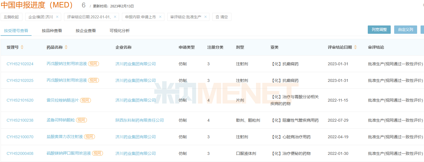 2022年,济川药业已有雷贝拉唑钠肠溶片、孟鲁司特钠颗粒、盐酸奥普力农注射液、硫酸镁钠钾口服用浓溶液4款高端仿制药获批。其中,雷贝拉唑钠肠溶片在2021年中国公立医疗机构终端是20亿级别大品种,而盐酸奥普力农注射液则在2022年上半年同比增长超过200%。