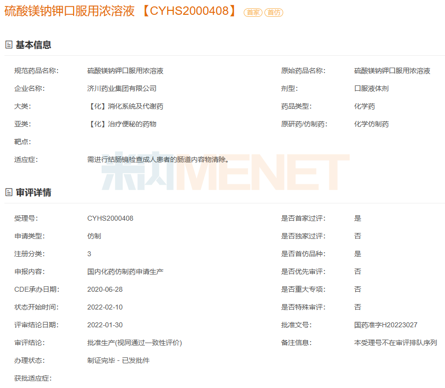 硫酸镁钠钾口服用浓溶液由美国Braintree Laboratories研发,是一种新型肠道清洁准备剂。目前,该产品有3家企业拥有生产批文,2022年2月,济川药业拿下首仿,随后扬子江药业集团上海海尼药业、博福-益普生陆续获批。