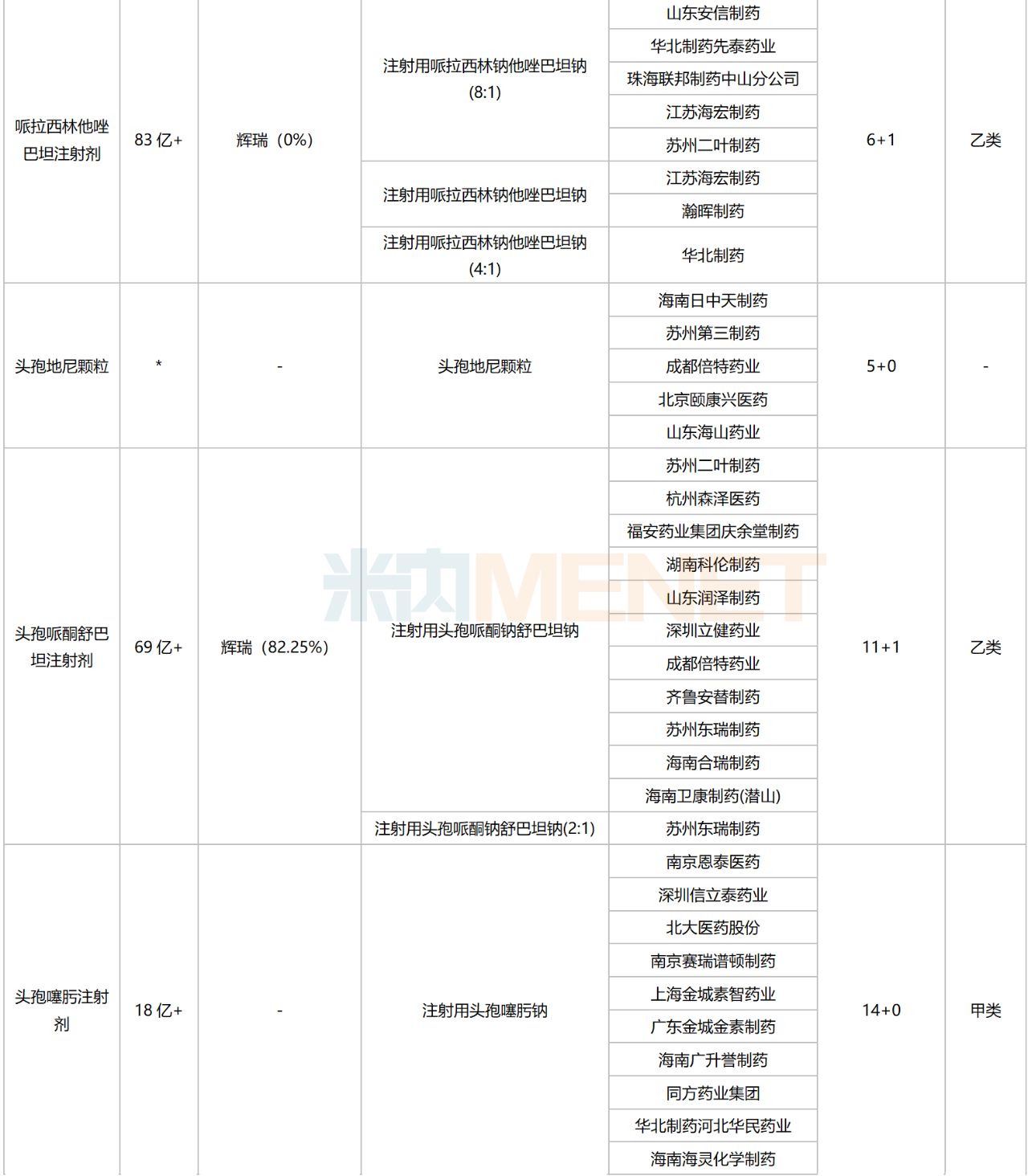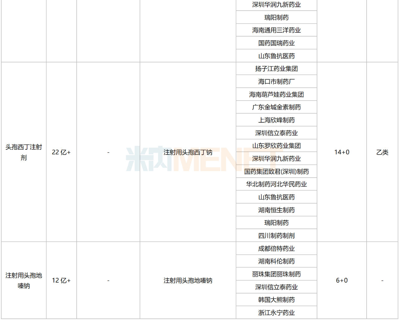 14个品种涵盖6个治疗小类,集中在头孢类、青霉素类/β-内酰胺类及其他抗菌药,分别有5个、3个、3个品种在列。