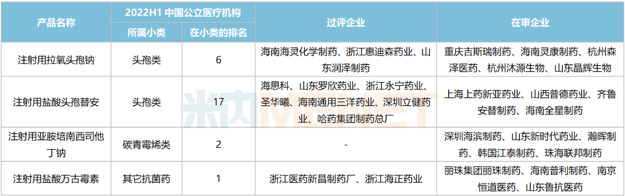 2021年中国公立医疗机构终端销售额超过10亿元且暂未纳入国采的抗菌药中,注射用拉氧头孢钠(23亿+)、注射用盐酸头孢替安(10亿+)、注射用盐酸万古霉素(19亿+)均已有企业过评。