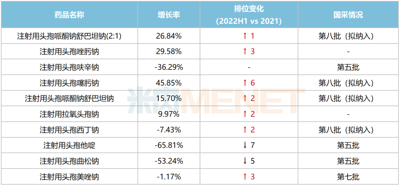 从2022H1中国公立医疗机构终端头孢类抗菌药TOP10产品看,除了注射用头孢唑肟钠、注射用拉氧头孢钠,其余8个产品已被纳入/拟纳入国采,其中被纳入第五批集采的注射用头孢呋辛钠、注射用头孢他啶、注射用头孢曲松钠销售额均出现下滑,排位不变或下滑。