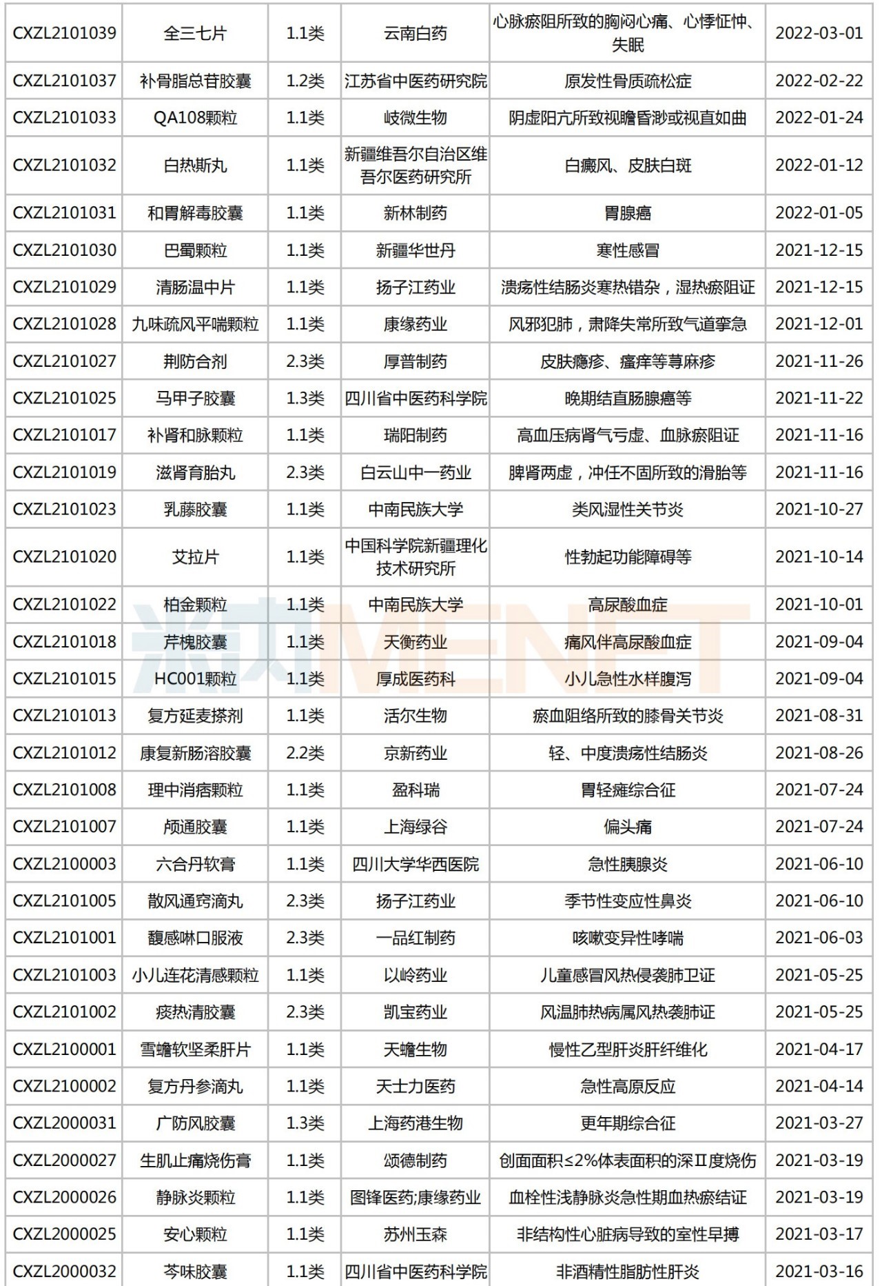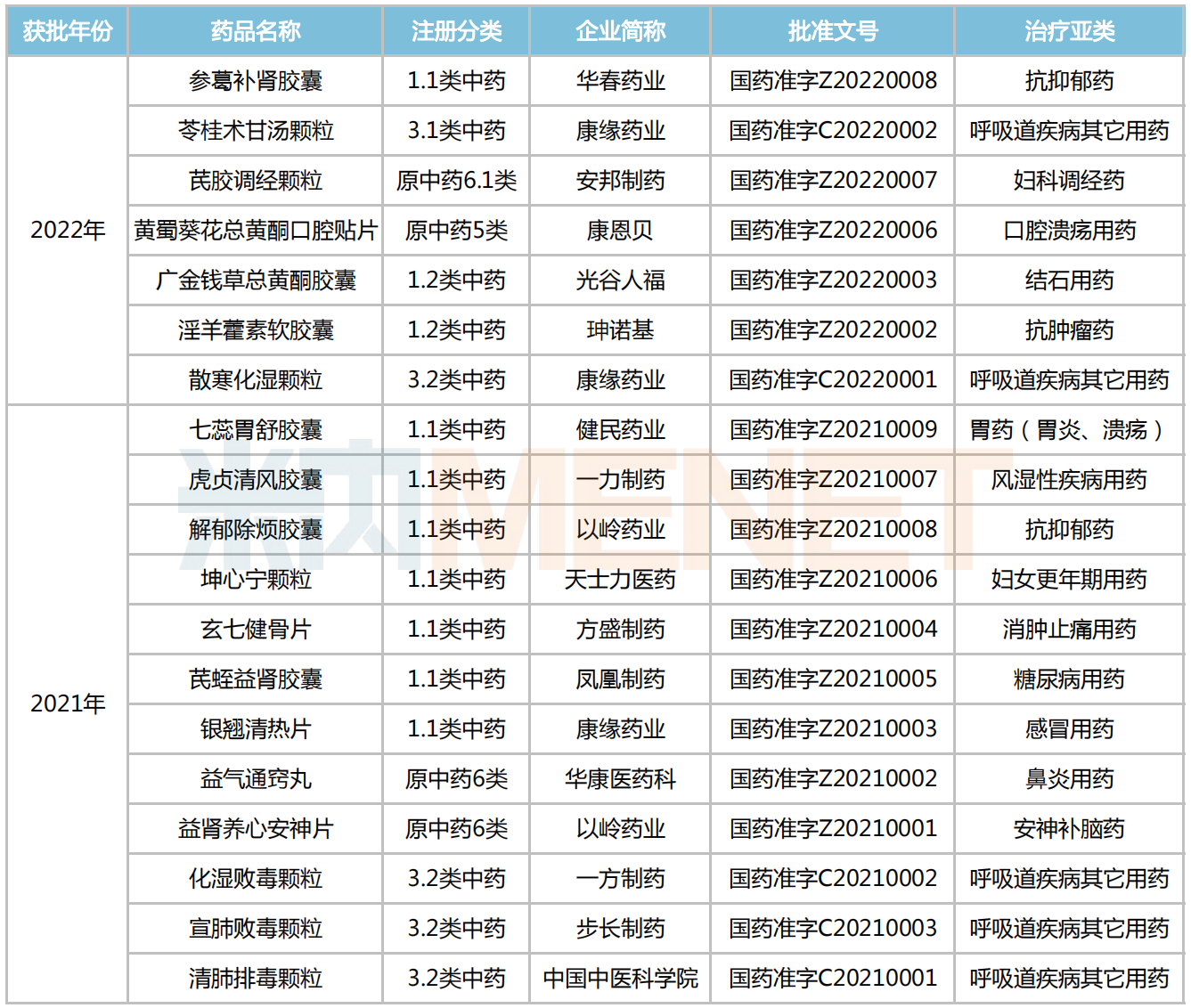 2021-2022年获批上市中成药