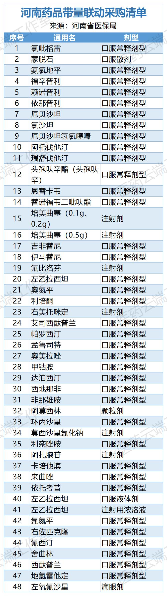 近日,河南省医保局下发通知,该省将对48个品种进行带量联动。这些品种都是国家集采品种,从4+7集采到第二批均有。具体品种如下表所示。