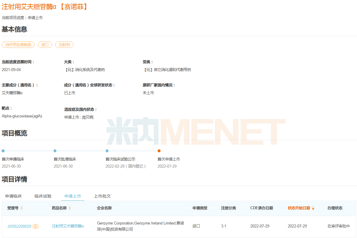 注射用艾夫糖苷酶α项目进度