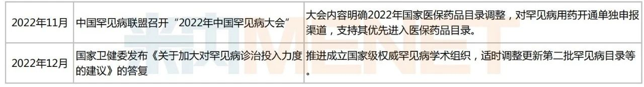 2018年5月,国家卫健委、工业和信息化部、国家药监局等五部门联合发布《第一批罕见病目录》,共涉及121种罕见病(文末附病种目录),为各部门制定罕见病相关政策提供重要依据。2022年11月,中国罕见病联盟召开2022年中国罕见病大会称,2022年国家医保药品目录调整,对罕见病用药开通单独申报渠道,支持其优先进入医保药品目录......