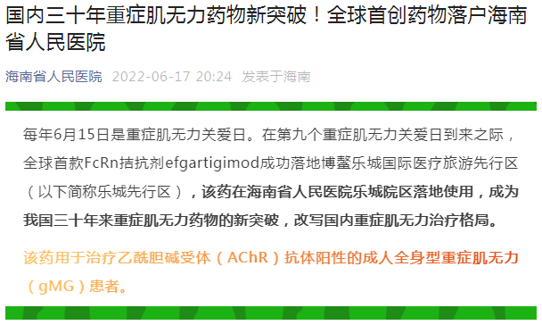根据再鼎医药新闻稿介绍,艾加莫德α注射液是首个在美国和日本获批用于成人全身型重症肌无力治疗的FcRn拮抗剂,并已成功落地我国海南博鳌乐城国际医疗旅游先行区。2022年6月,海南省人民医院乐城分院在国内开出该药首个处方,预示着三十年来我国重症肌无力药物即将开启的新突破。
