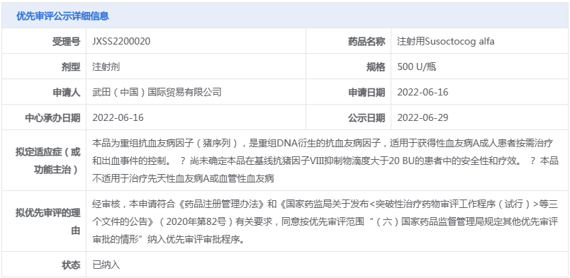 据悉,注射用Susoctocog alfa是首个获得美国FDA及欧洲EMA批准用于获得性血友病的重组猪FⅧ药物。2022年6月,该药的上市申请(JXSS2200020)获CDE受理,随后被纳入优先审评,拟用于获得性血友病A成人患者按需治疗和出血事件的控制。