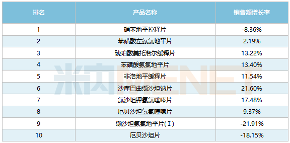 高血压用药产品TOP10中,硝苯地平控释片、苯磺酸左氨氯地平片、琥珀酸美托洛尔缓释片依次位列前三;2022上半年5个产品销售额超过10亿元,“一哥”硝苯地平控释片销售额超过30亿元。从销售额增速来看,5个产品涨逾10%,沙库巴曲缬沙坦钠片涨幅达21.60%。