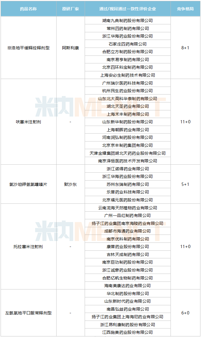 从竞争格局上看,呋塞米注射剂、托拉塞米注射剂这2款注射剂竞争最激烈,符合条件企业数均达到11家;非洛地平缓释控释剂型符合条件企业数有9家,竞争压力亦不小;氯沙坦氢氯噻嗪口服常释剂型、左氨氯地平口服常释剂型符合条件企业数均有6家,竞争格局较好。