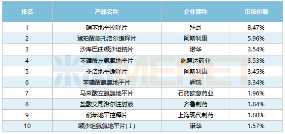 高血压用药品牌TOP10中,阿斯利康、诺华各有2个品牌上榜,拜耳的硝苯地平控释片再次蝉联榜首,阿斯利康的琥珀酸美托洛尔缓释片位列第二,诺华的沙库巴曲缬沙坦钠片位列第三;国产品牌有4个,其中施慧达的苯磺酸左氨氯地平片位列第四,石药欧意的马来酸左氨氯地平片位列第七。