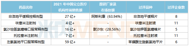 数据显示,5个品种2021年在中国公立医疗机构终端的销售规模合计超过113亿元。其中,3个品种的销售额超过15亿元,左氨氯地平口服常释剂型以超59亿元销售额领跑,非洛地平缓释控释剂型销售额超过27亿元,氯沙坦氢氯噻嗪口服常释剂型销售额超过16亿元。