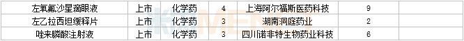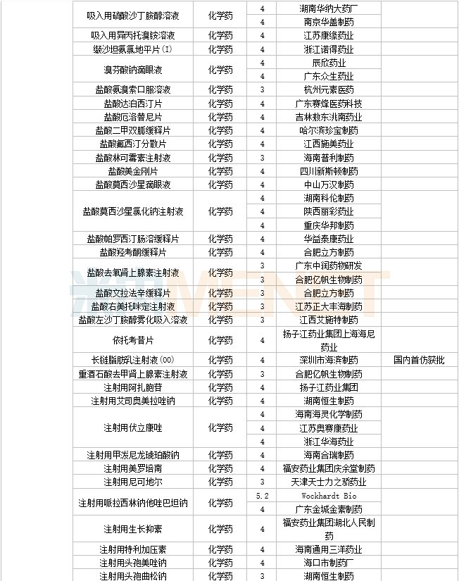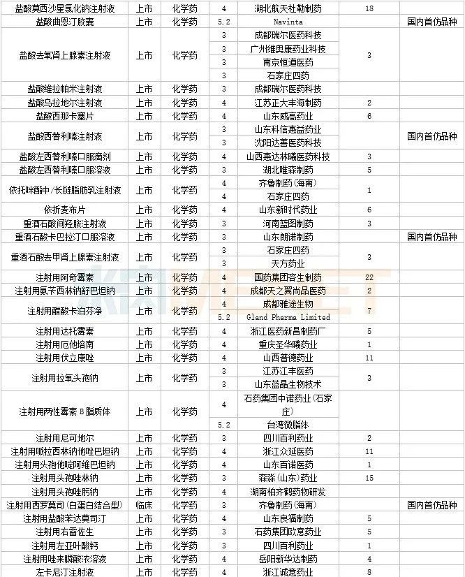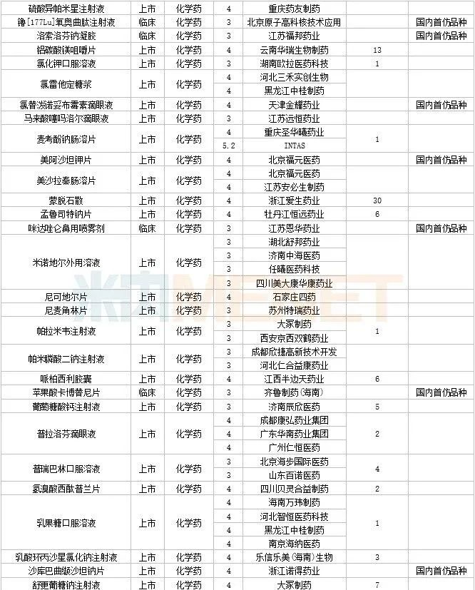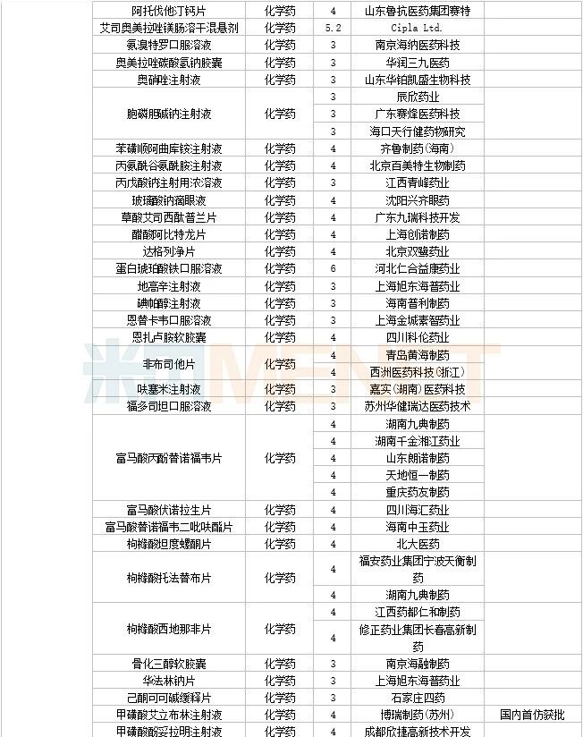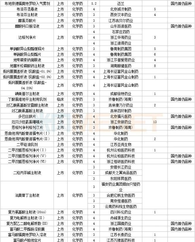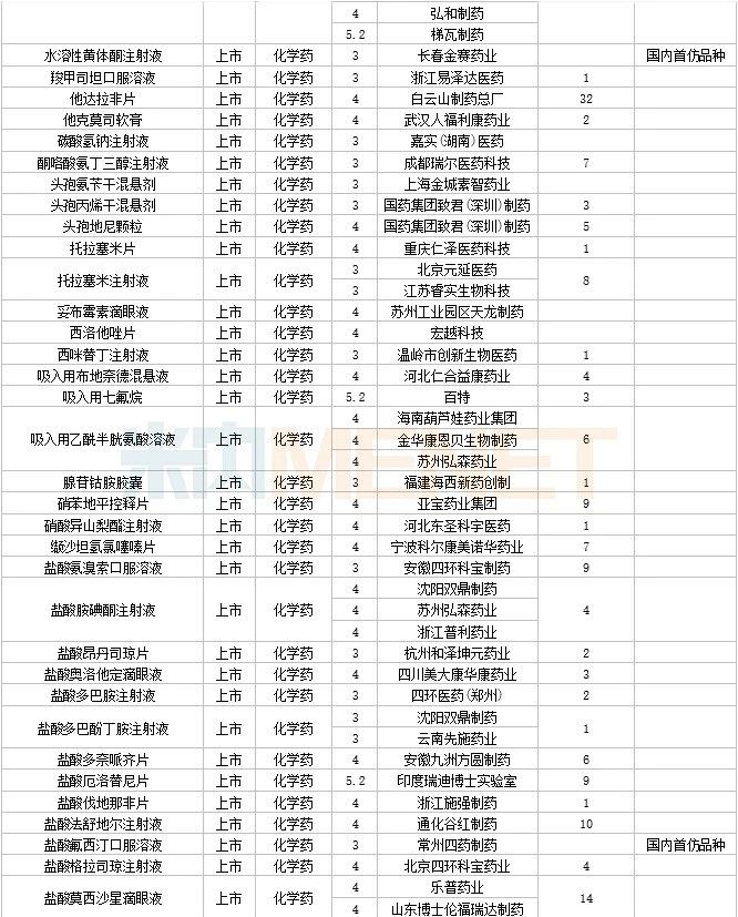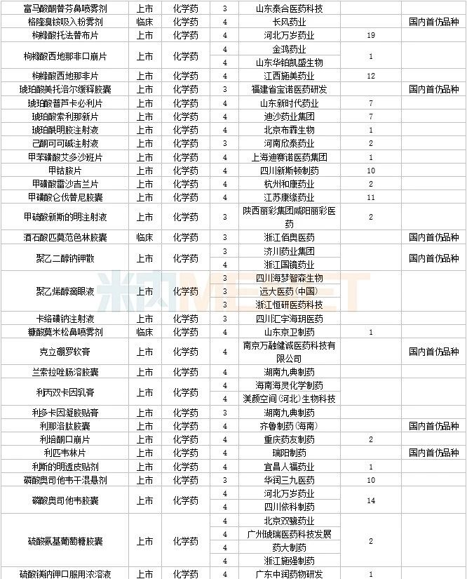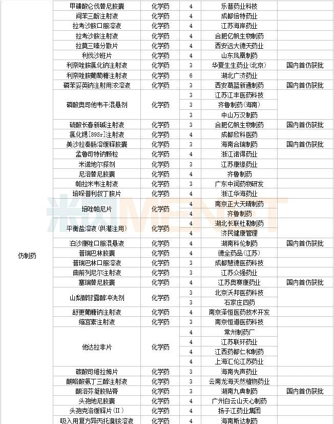 108个仿制药获批,其中阿普米司特片(石药集团欧意药业)、甲磺酸艾立布林注射液(博瑞制药(苏州))、利奈唑胺氯化钠注射液(华夏生生药业(北京))、磷苯妥英钠注射用浓溶液(西安葛蓝新通制药)、硫酸长春新碱注射液(合肥亿帆生物制药)、美沙拉秦肠溶缓释胶囊(海南合瑞制药)、泊沙康唑口服混悬液(湖南科伦制药)、塞瑞替尼胶囊(江苏奥赛康药业)、酮洛芬凝胶贴膏(湖南九典制药)、长链脂肪乳注射液(OO)(深圳市海滨制药)、注射用头孢西丁钠/葡萄糖注射液(湖南科伦制药) 为国内首仿品种。