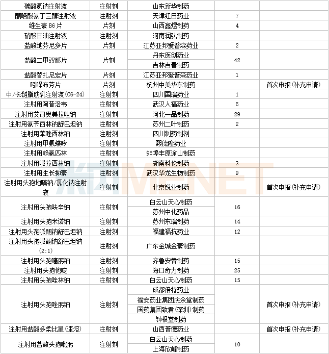 2023年3月,54个品种的一致性评价补充申请获CDE承办。其中布美他尼注射液、茶苯海明片、对乙酰氨基酚泡腾颗粒、复方磺胺甲噁唑注射液、铝镁匹林片(Ⅱ)、吲哚布芬片、注射用头孢地嗪钠/氯化钠注射液、注射用头孢唑肟钠、注射用盐酸多柔比星(速溶)等9个品种为首次申报。