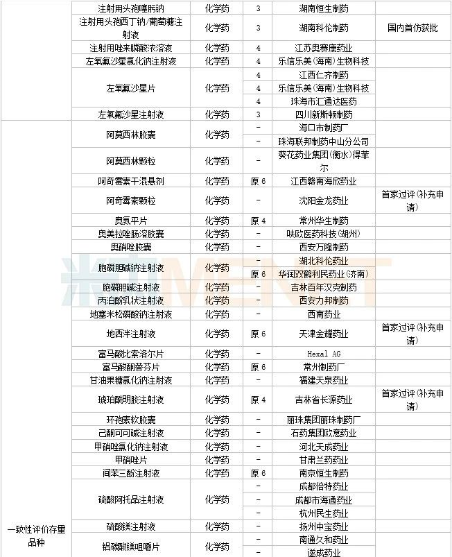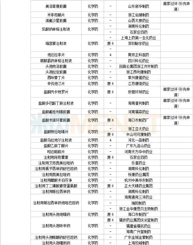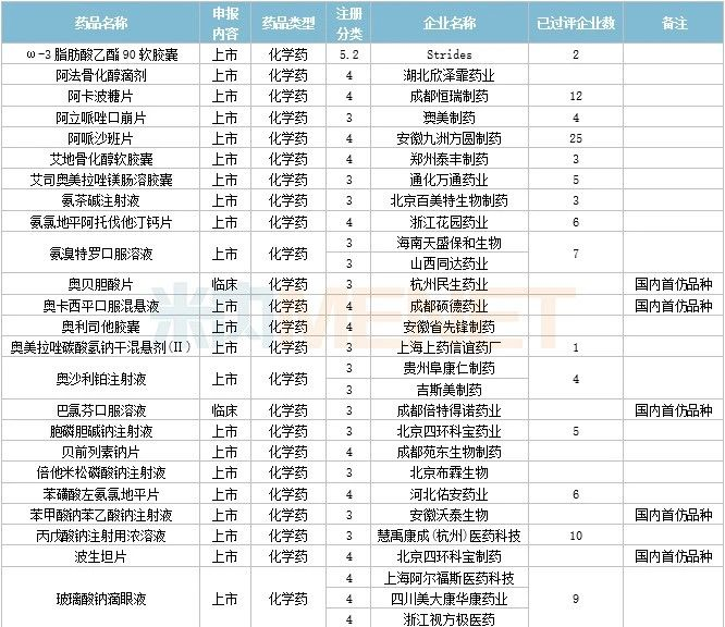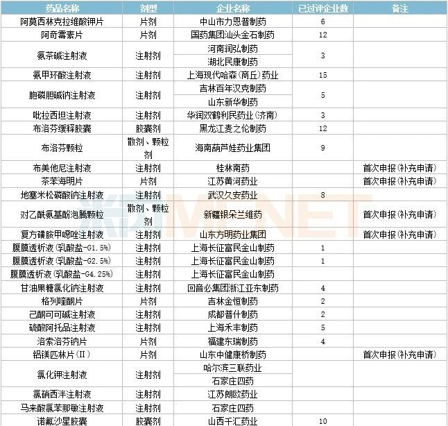 61个存量品种有企业过评,其中阿奇霉素颗粒(沈阳金龙药业)、地西泮注射液(天津金耀药业)、琥珀酰明胶注射液(吉林省长源药业)、美洛昔康胶囊(山东新华制药)、盐酸丙卡特罗片(安徽环球药业)、盐酸多巴酚丁胺注射液(海南普利制药)、盐酸米诺环素胶囊(海口市制药厂) 为首家过评。