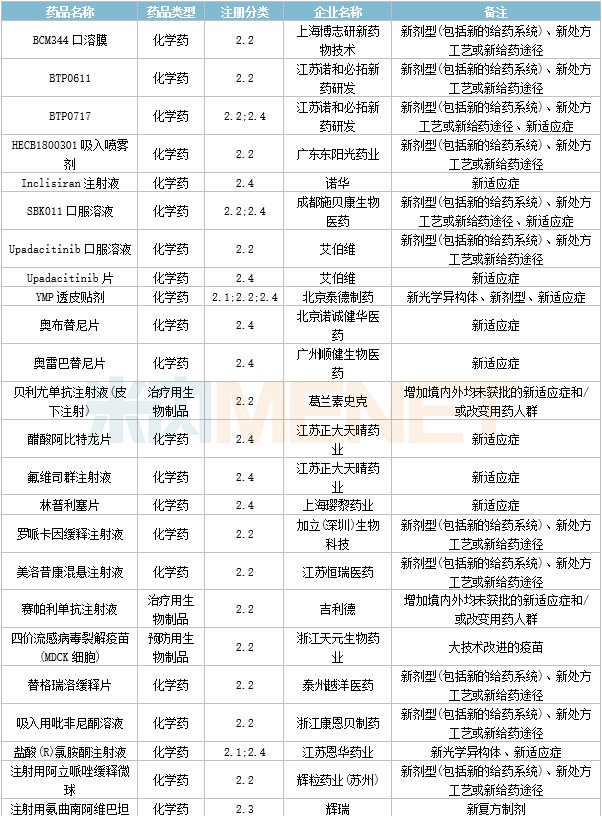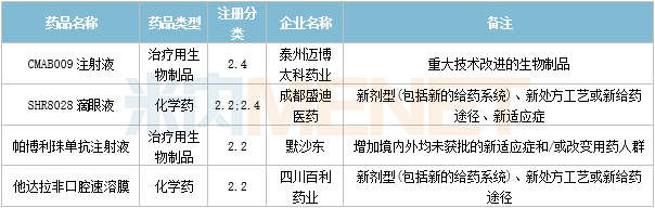 4个生物类似药获批,分别属于正大天晴药业集团南京顺欣制药、江苏泰康生物医药、杭州中美华东制药、海正生物制药。
