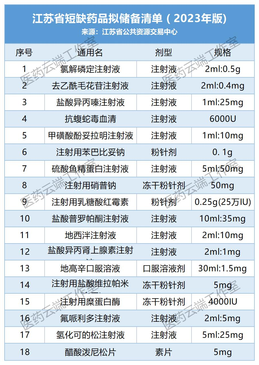 按此前发布的通知来看,此次江苏省级拟储备药品涉及氯解磷定注射液、去乙酰毛花苷注射液、盐酸异丙嗪注射液、抗蝮蛇毒血清等18个短缺药品,如下表所示: