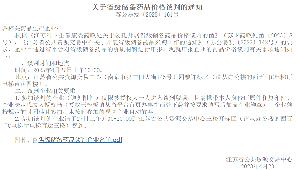 4月23日,江苏省公共资源交易中心发出《关于省级储备药品价格谈判的通知》,根据《江苏省卫生健康委药政处关于委托开展省级储备药品价格谈判的函》(苏卫药政便函〔2023〕8号)、《江苏省公共资源交易中心关于开展省级储备药品采购工作的通知》(苏公易发〔2023〕142号)的要求,江苏省将于4月27日上午10:00进行省级储备药品价格谈判。