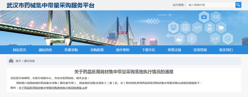 其中,湖北武汉市医保局发布《关于药品医用耗材集中带量采购落地执行情况的通报》显示,武汉市针对胰岛素、冠脉支架、骨科创伤类医用耗材的整体约定采购量完成度均超过100%。不过,武汉大学人民医院、华中科技大学同济医学院附属梨园医院等多家医院因采购进度未达标被通报。