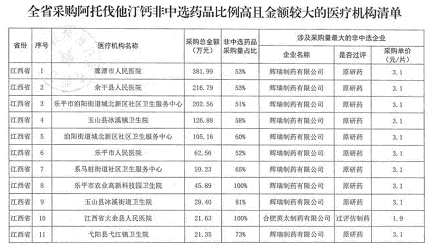 江西省医保局发布《关于部分药品集中带量采购执行情况的通报》,重点针对采购阿托伐他汀钙非中选药品、氨氯地平非中选药品比例高且金额较大的医疗机构进行了通报,多家医疗机构被点名。