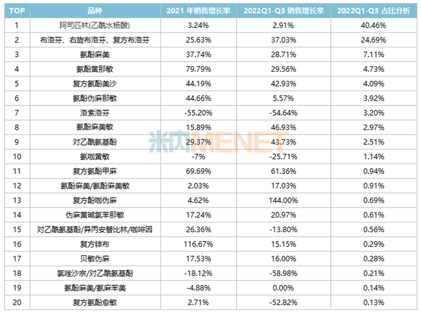 居前10位的品种分别是阿司匹林(乙酰水杨酸)、布洛芬系列、氨酚麻美、氨酚黄那敏、复方氨酚美沙、氨酚伪麻那敏、洛索洛芬、氨酚麻美敏、对乙酰氨基酚、氨加黄敏,前10个品种用药金额占32个药物市场的93.56%。