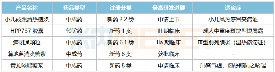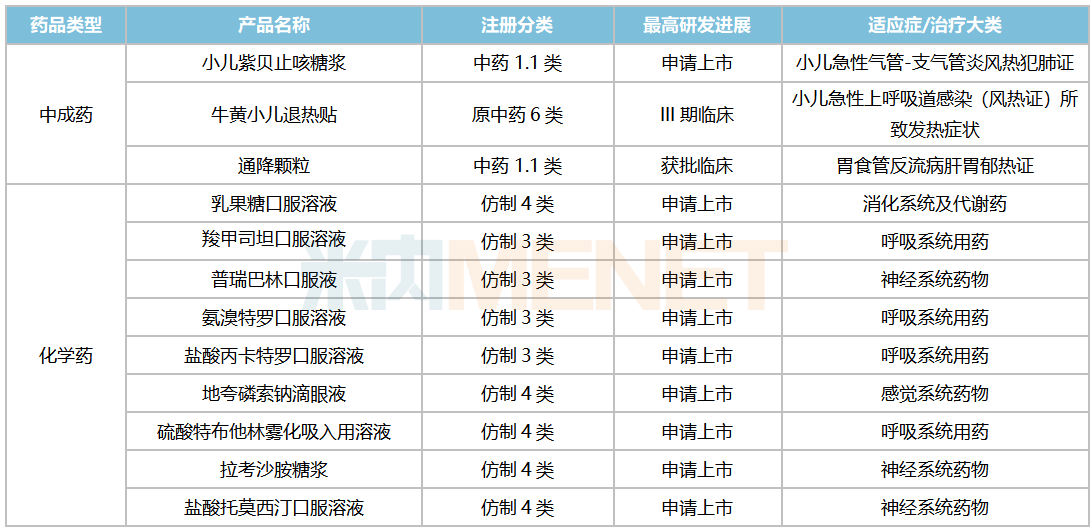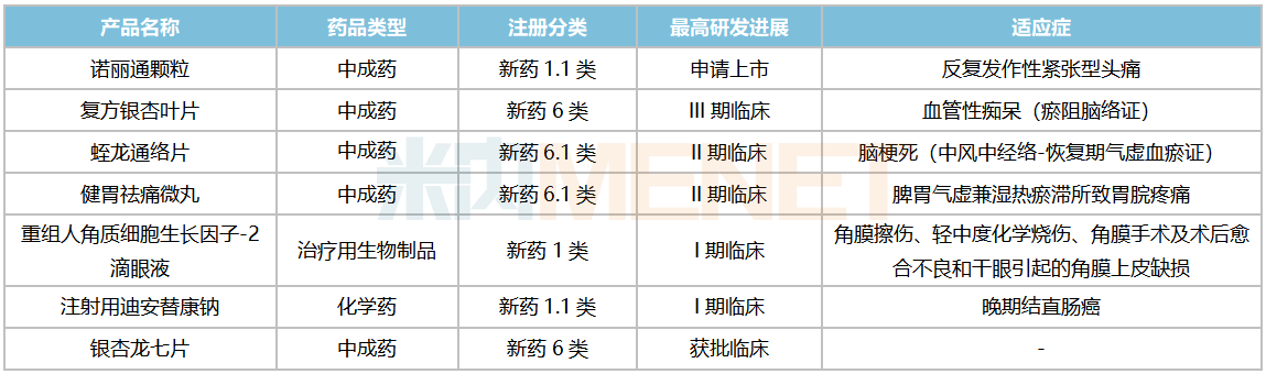 在创新中药方面,继小儿荆杏止咳颗粒、玄七健骨片相继获批后,中药1.1类新药诺丽通颗粒完成III期临床研究并提交了上市申请,适应症为反复发作性紧张型头痛。此外,用于血管性痴呆(瘀阻脑络证)的复方银杏叶片已步入III期临床,蛭龙通络片、健胃祛痛微丸均处于II期临床。