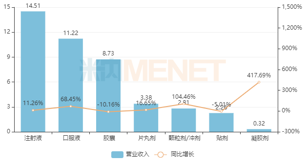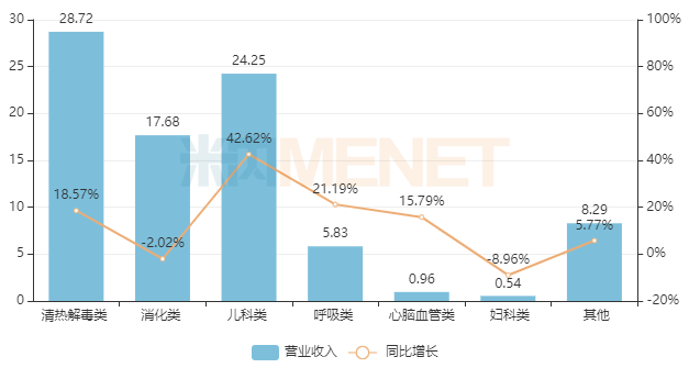 济川药业产品线主要围绕清热解毒、儿科、消化等治疗领域。在独家品种小儿豉翘清热颗粒销售收入上升拉动下,公司儿科类产品收入同比增长42.62%。米内网数据显示,在中国城市公立医院、县级公立医院、城市社区中心以及乡镇卫生院(简称中国公立医疗机构)终端儿科中成药产品排名中,小儿豉翘清热颗粒多年来稳居首位。