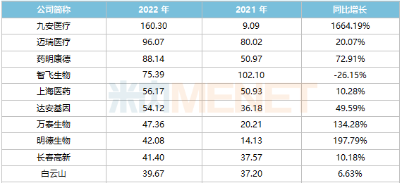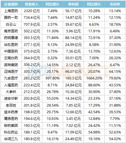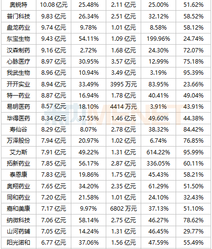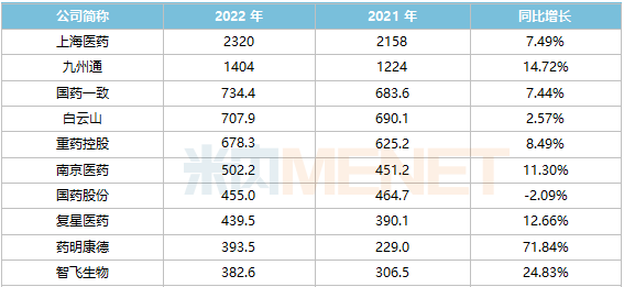 从营收来看,超100亿元的医药企业多达53家,数量与2021年相比增加了6家。TOP10中,上海医药、九州通两大千亿龙头领军,药明康德、智飞生物增速超20%。