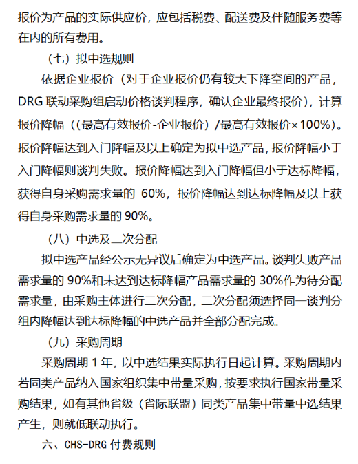 拟中选规则依据企业报价(对于企业报价仍有较大下降空间的产品,DRG联动采购组启动价格谈判程序,确认企业最终报价),计算报价降幅((最高有效报价-企业报价)/最高有效报价×100%)。报价降幅达到入门降幅及以上确定为拟中选产品,报价降幅小于入门降幅则谈判失败。报价降幅达到入门降幅但小于达标降幅,获得自身采购需求量的60%,报价降幅达到达标降幅及以上获得自身采购需求量的90%。