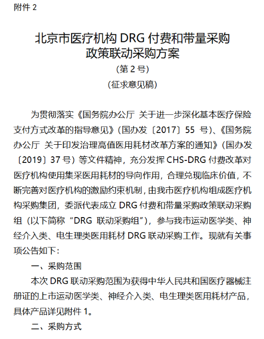 《通知》显示,为贯彻落实《国务院办公厅 关于进一步深化基本医疗保险支付方式改革的指导意见》、国务院办公厅 关于印发治理高值医用耗材改革方案的通知》等文件精神,充分发挥CHS-DRG付费改革对医疗机构使用集采医用耗材的导向作用,不断完善对医疗机构的激励约束机制,由北京市医疗机构组成医疗机构DRG联动采购集团,针对运动医学类、神经介入类、电生理类医用耗材制定了DRG付费和带量采购政策联动采购方案。《通知》提出了两个政策联动方案,并就方案内容公开征求意见。