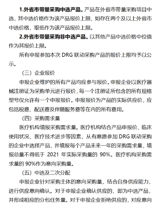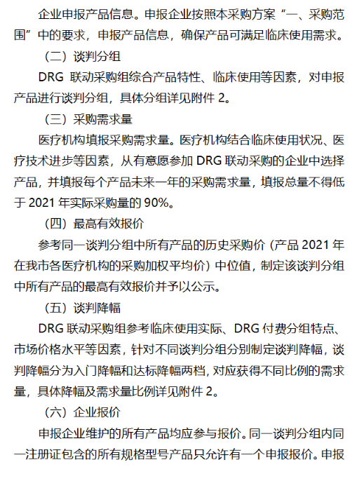 两份方案的产品申报要求相同,申报企业按照本采购方案“一、采购范围”中的要求,申报产品信息,确保产品可满足临床使用需求。医疗机构填报采购需求量均为,医疗机构结合临床使用状况、医疗技术进步等因素,从有意愿参加DRG联动采购的企业中选择产品,并填报每个产品未来一年的采购需求量,填报总量不得低于2021年实际采购量的90%。