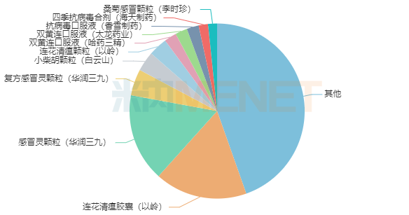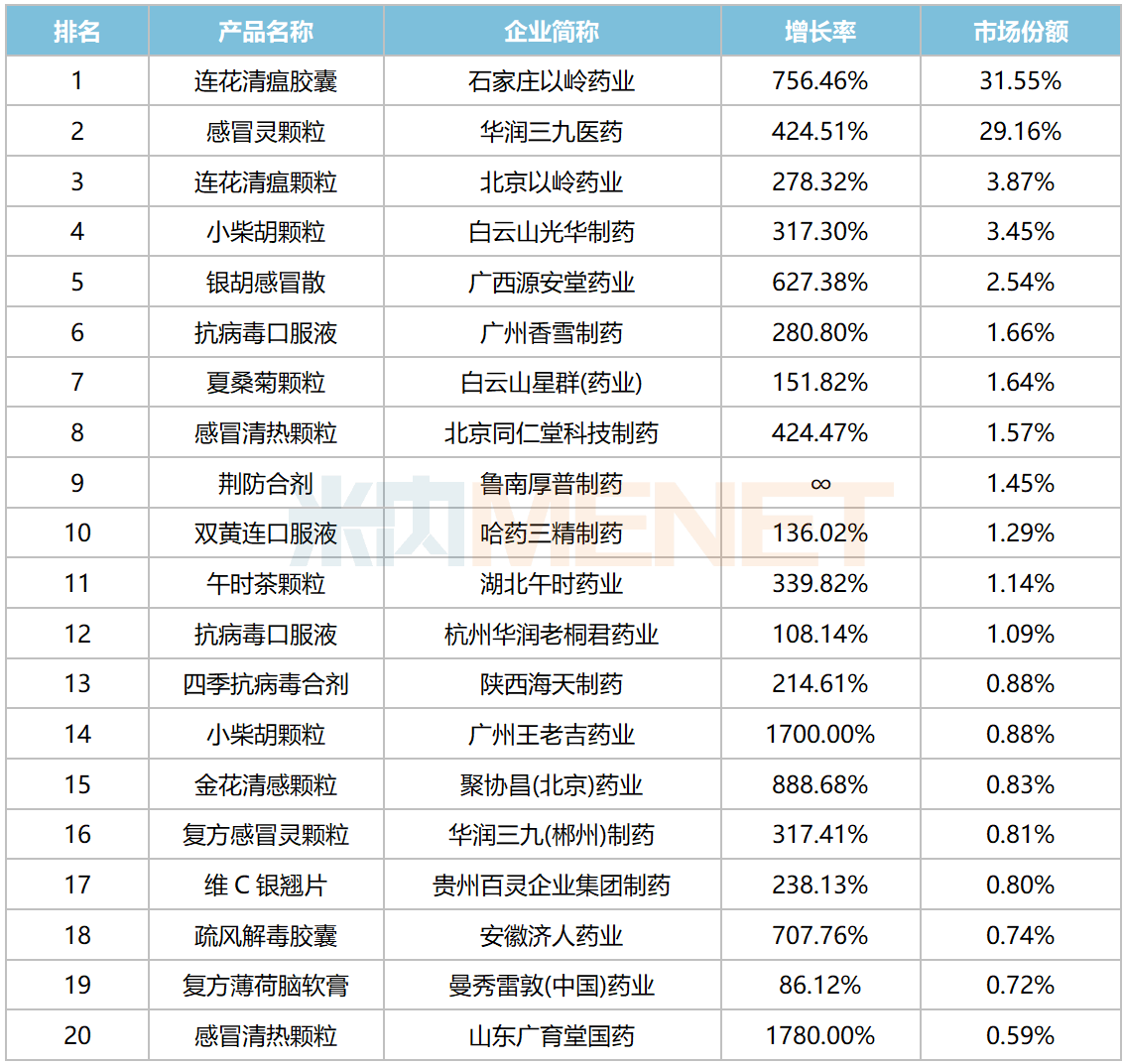 从企业上榜品牌数看,华润医药霸榜,共有5个品牌上榜TOP20,包括感冒灵颗粒、复方感冒灵颗粒、抗病毒口服液、小柴胡颗粒等;以岭药业、云南白药、广药集团紧接其后,均有2个品牌上榜,其中以岭药业的连花清瘟胶囊及连花清瘟颗粒,白云山的小柴胡颗粒、云南白药的伤风停胶囊增速均超过40%。