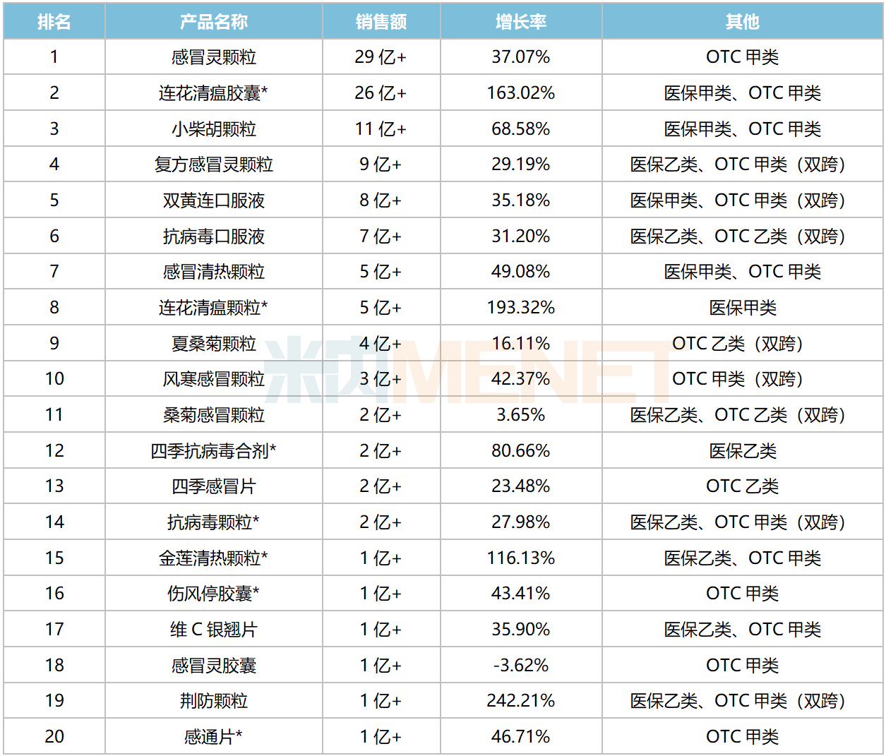 品牌TOP20中,“一哥”易主,由以岭药业的连花清瘟胶囊拿下,占据约17%的市场份额;而华润三九的感冒灵颗粒位居第二,销售额超过25亿元,占据约16%的市场份额;华润三九另一款产品复方感冒灵颗粒位列第三。