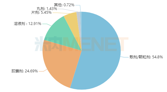 从剂型分布看,散剂/颗粒剂为主剂型,占据“半壁江山”;胶囊剂紧接在后,占比接近25%;溶液剂排位第三,占比超过10%。