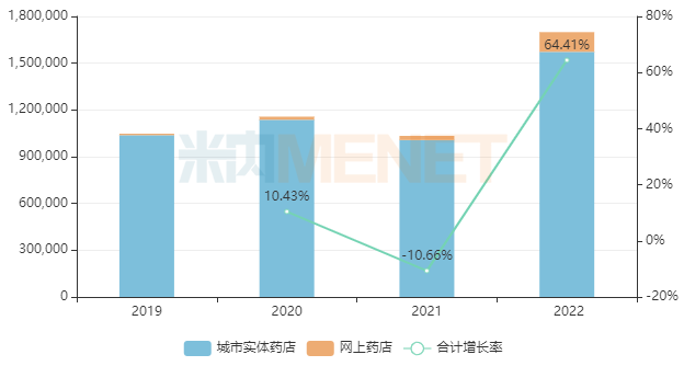 从细分市场看,中国城市实体药店为感冒中成药销售“主战场”,占比超过90%;网上药店基数虽小,但增速迅猛,2022年同比增长超过300%,且占比逐年提升。