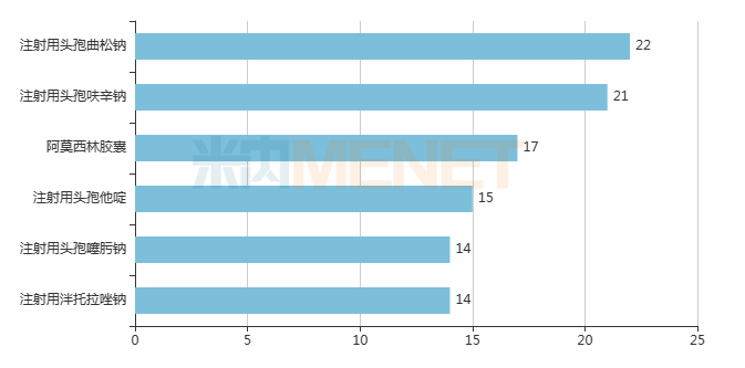 13个通过审核的产品企业数超过10家,注射剂居多。其中,注射用头孢曲松钠(22家)、注射用头孢呋辛钠(21家)、阿莫西林胶囊(17家)和注射用头孢他啶(15家)4个产品竞争最为激烈。