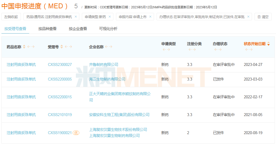 曲妥珠单抗生物类似药企业申报上市情况