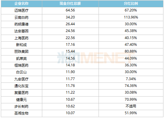 从现金分红总额来看,迈瑞医疗稳居首位,云南白药排第二位,药明康德、达安基因、上海医药、丽珠集团、凯莱英、恒瑞医药等均超10亿元。