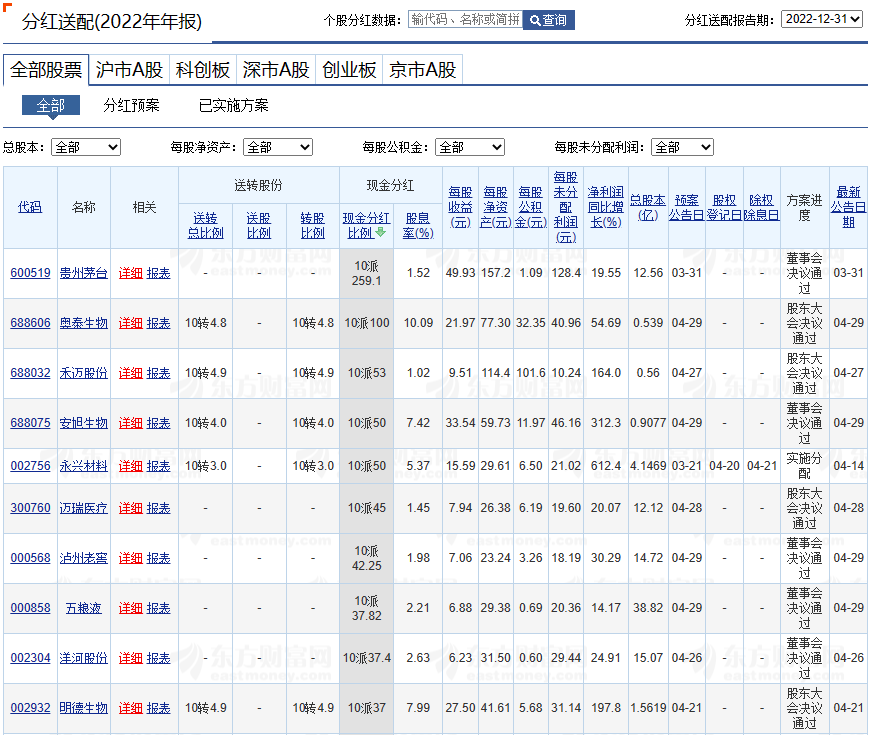 近日,沪深两地交易所发布上市公司2022年年报分析报告,超过2900家公司披露了现金分红事项,合计分红总额超过2万亿元,创历史新高。其中,沪市共有1194家公司推出分红方案,占全部盈利公司家数的87%,现金分红总额1.67万亿元,同比增长13%;深市共有1740家公司推出分红预案,累计分红金额合计超4200亿元。值得注意的是,现金分红TOP10企业中,医药股占据4个席位。此外,还有不少医药企业也纷纷推出了豪气的分红方案。